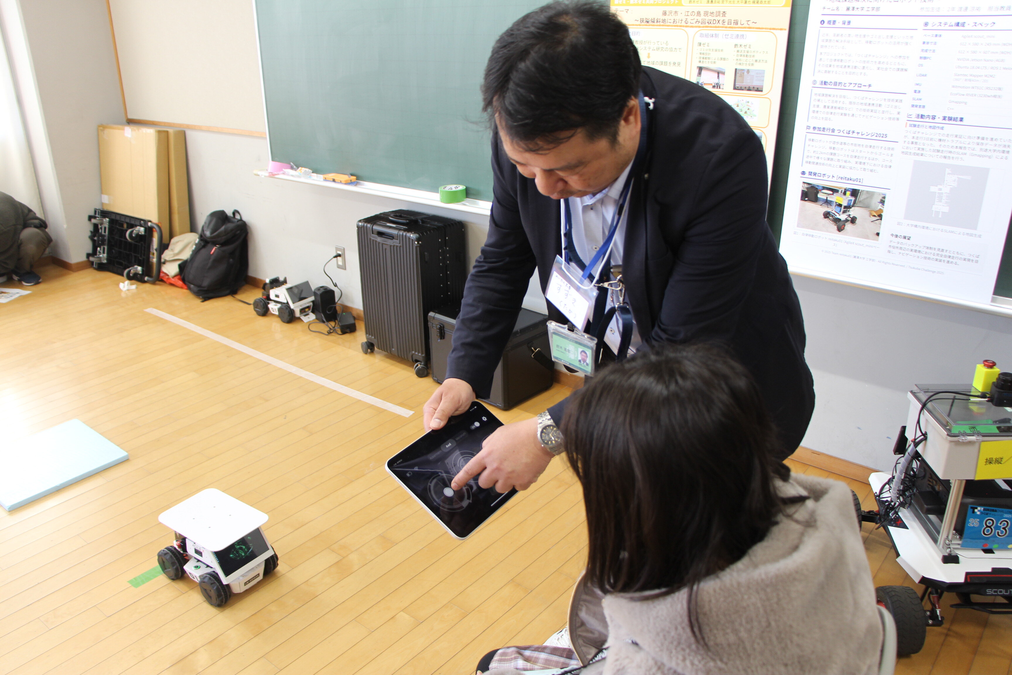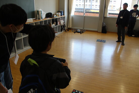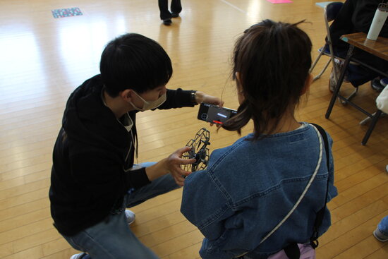 会場には、幼稚園生から高校生まで、幅広い年齢の子どもたちが来場。はじめに学生と教員から操作方法のレクチャーを受けた後、実際に自分たちの手でレスキューロボットやドローンを動かします。初めて触れる機器に最初は少し緊張した様子の子どもたちも、操作に慣れてくると「できた!」「動いた!」と歓声を上げながら夢中で体験していました。