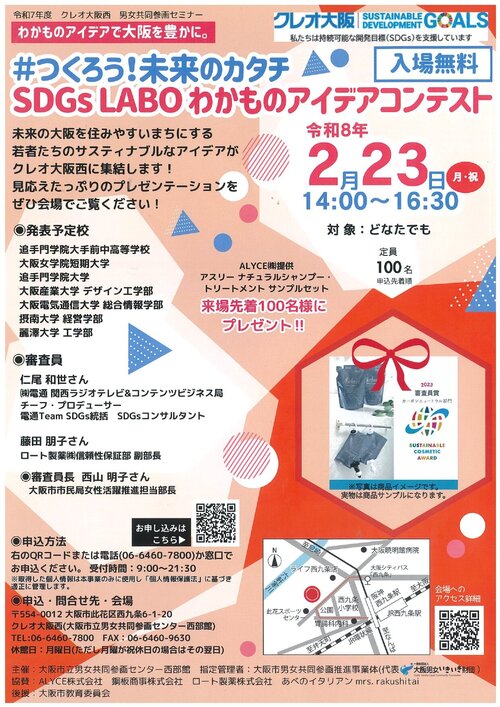 本コンテストは、未来の大阪を持続可能で住みやすいまちにすることを目的に開催されるもので、SDGsのゴール5「ジェンダー平等の実現」を含む社会課題に対し、若者ならではの視点から創意あふれる提案を発信する場です。