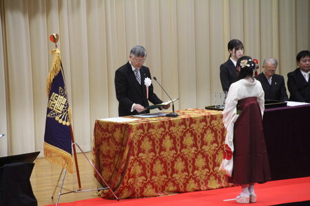 その後、卒業生代表が答辞を述べ、大学生活を振り返りながら「大学生活では、授業やサークル活動、自主企画ゼミナールなどを通して、自分自身で考え選択し行動することの大切さを学びました。特に北海道ニセコ町での自主企画ゼミナールでの活動を通して、自分の目で見て感じたことを大切にし、仲間とともに考えることの大切さを実感しました」と語りました。最後に、「本日、私たちは麗澤大学を卒業し、それぞれの新たな道へと歩み始めます。その先には新しい出会いや挑戦だけではなく、困難もあるかもしれません。しかし、麗澤大学での学びを胸に、これからも学び、考え、行動し、支え合いながら成長していきたいと思います」と述べ、支えてくれた教職員や家族、友人への感謝とともに、力強い決意を表明しました。