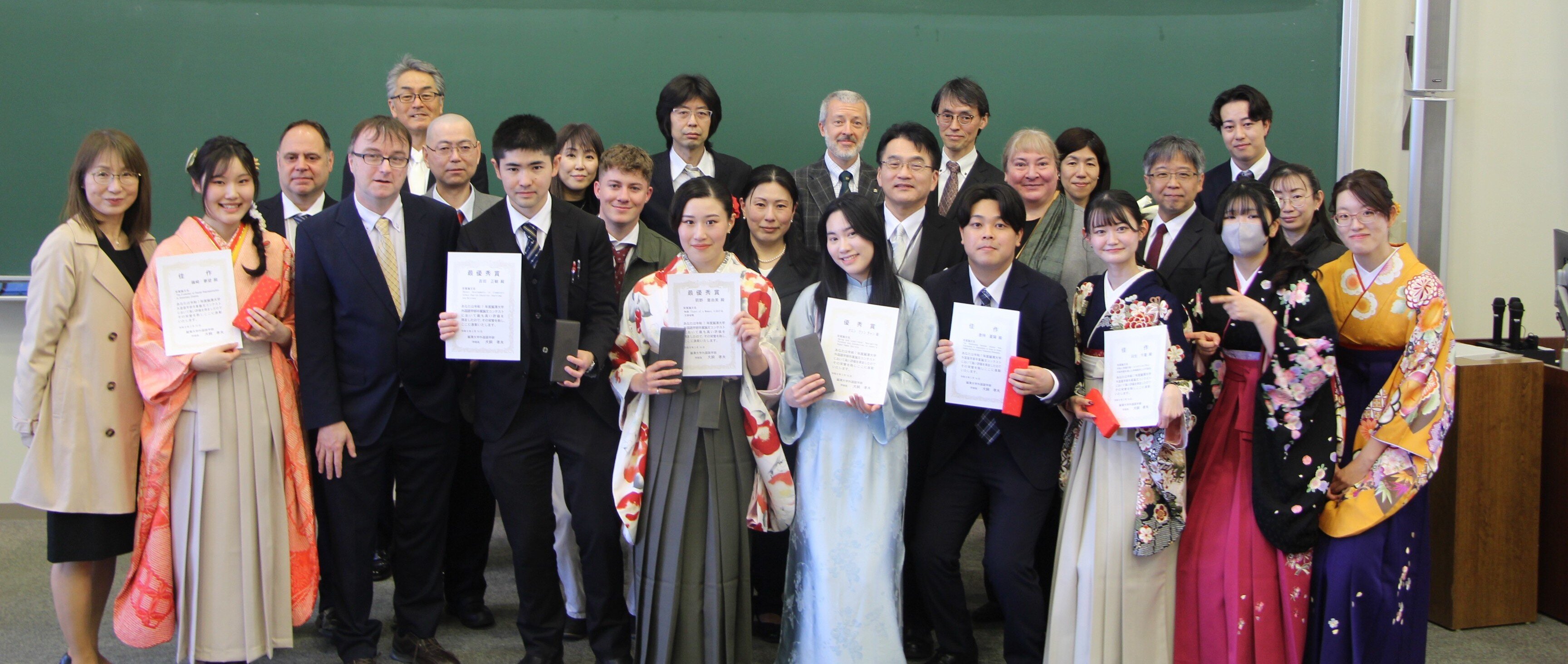 麗澤大学学位記授与式が開催された2026314日(土)に、毎年恒例となっている外国語学部卒業論文コンテストの授賞式が1503教室で開催され、6名の4年生が犬飼孝夫学部長から賞状と記念品を受け取りました。