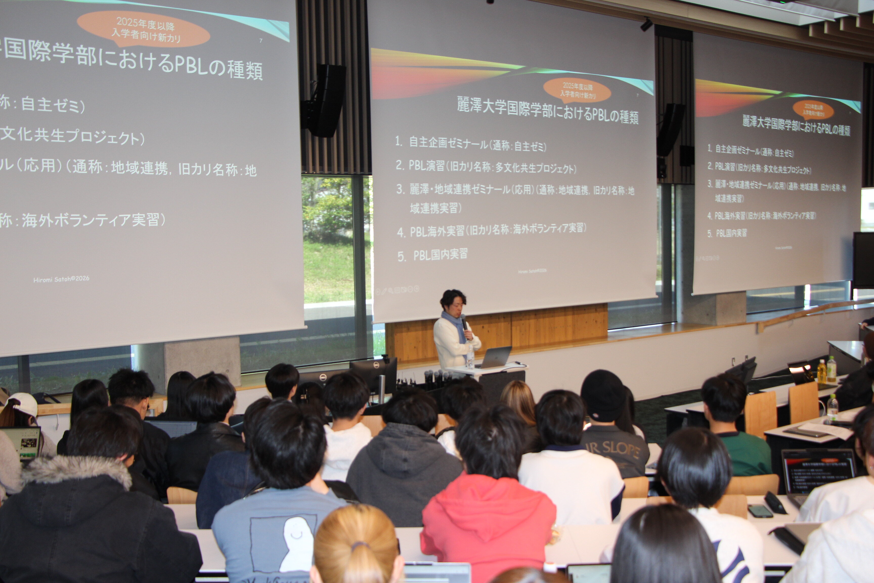 続いて、国際学部におけるPBLの仕組みや履修方法について説明が行われました。「自主企画ゼミ」「PBL演習」「麗澤・地域連携ゼミナール」「PBL海外実習」「PBL国内実習」など、多様な学びの選択肢が用意されており、学生一人ひとりが自分の興味や関心に応じて主体的に挑戦できる環境が整っています。本年度は、工学部生が企画する自主ゼミも参加し、文系・理系の枠を越えた「文理融合」が体現される機会となりました。自らテーマを設定し、仲間とともに活動をつくり上げていける点も、大きな魅力の一つです。